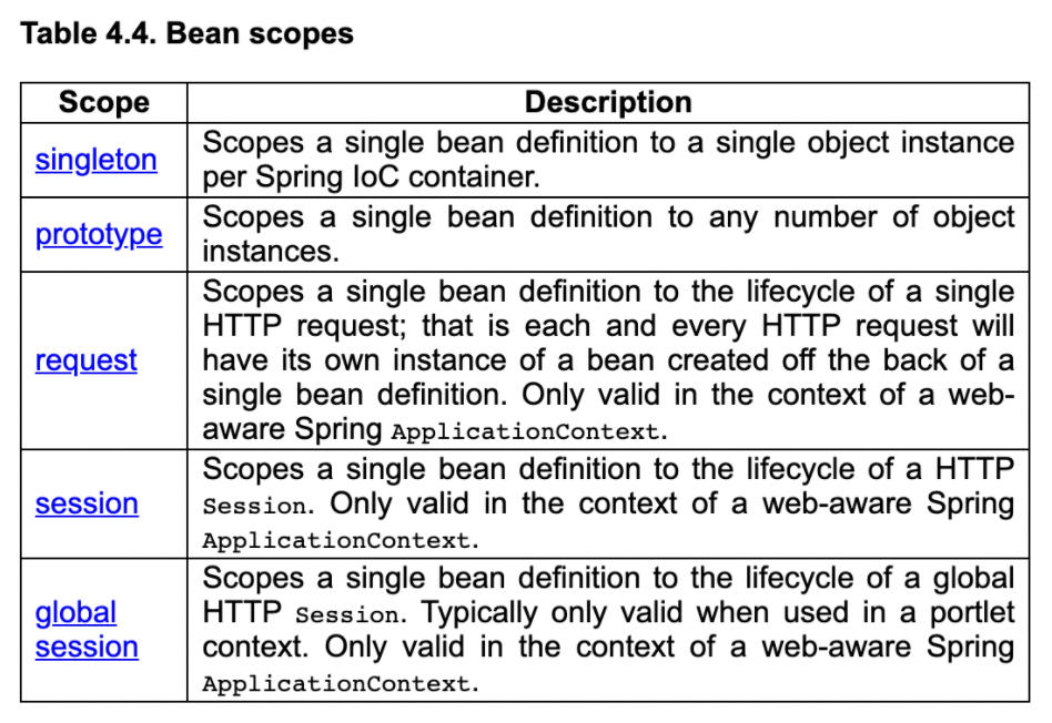 빈 스코프 빈이 존재할 수 있는 범위를 뜻한다. 크게 싱글톤과 프로토 타입이 있고 웹 스코프로 리퀘스트, 세션, 글로벌 세션이 있다. 스프링에선 따로 지정하지 않으면 디폴트 생성 옵션인 싱글