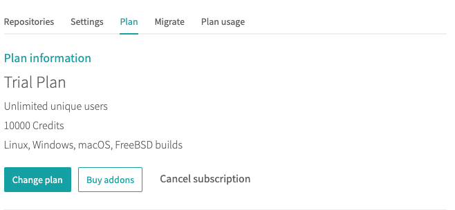 A free ‘Trial’ Plan, which any new user can select upon sign up, is a usage-based plan with an unlimited amount of users, which comes with a 10k trial pool of credits to start building right away. Once these credits run out, they are not replenished, and users must subscribe to a higher plan to continue building. Request OSS Credits allowance, or please consider one of our available plans. Trial credits are valid only for 30 days.