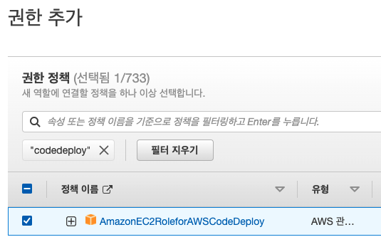 AmazonEC2RoleforAWSCodeDeploy 정책을 선택한다.