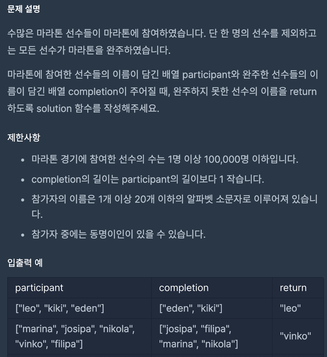 수많은 마라톤 선수들이 마라톤에 참여하였습니다. 단 한 명의 선수를 제외하고는 모든 선수가 마라톤을 완주하였습니다. 마라톤에 참여한 선수들의 이름이 담긴 배열 participant와 완주한 선수