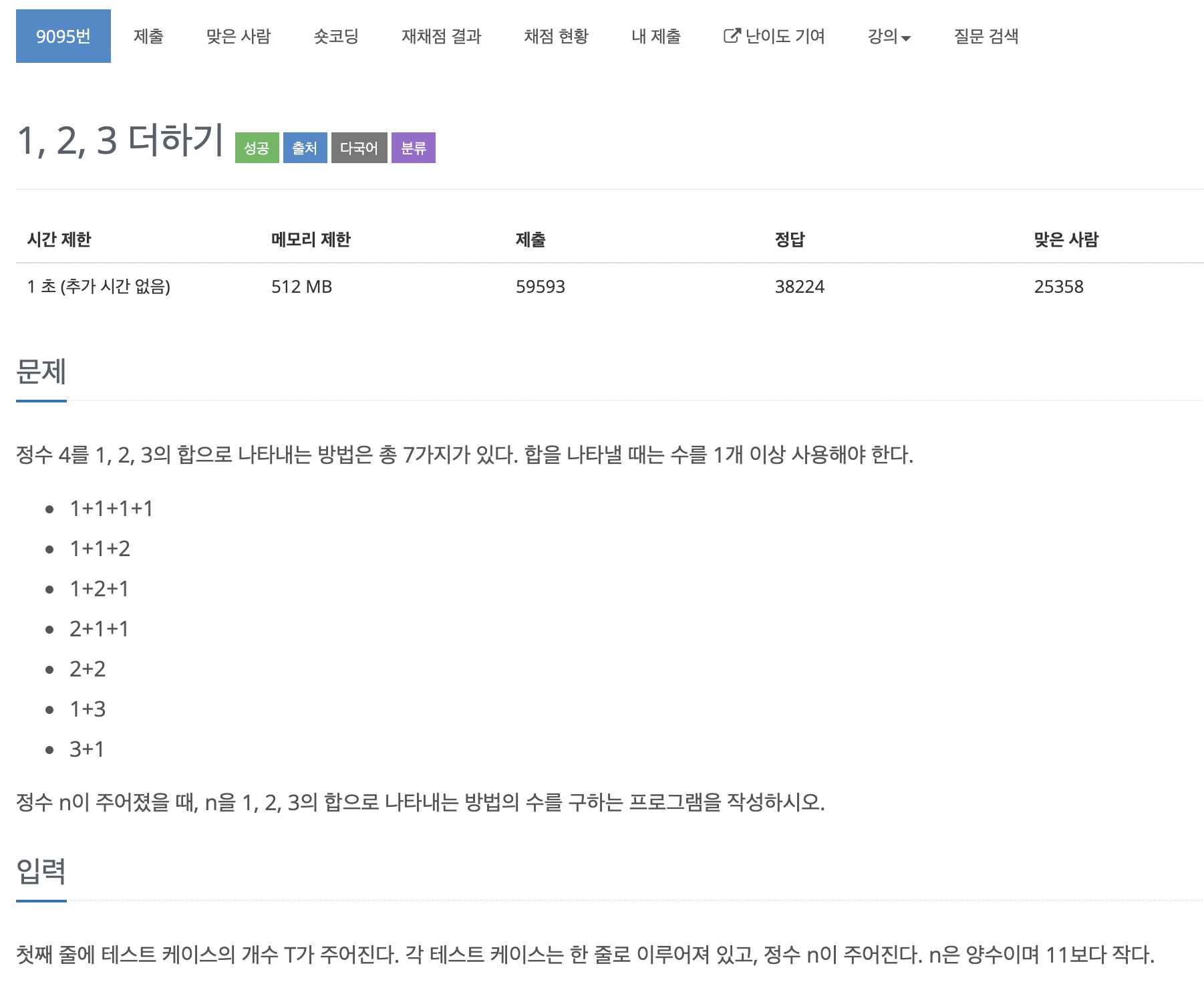 정수 n이 주어졌을 때, n을 1, 2, 3의 합으로 나타내는 방법의 수를 구하는 문제이다.
